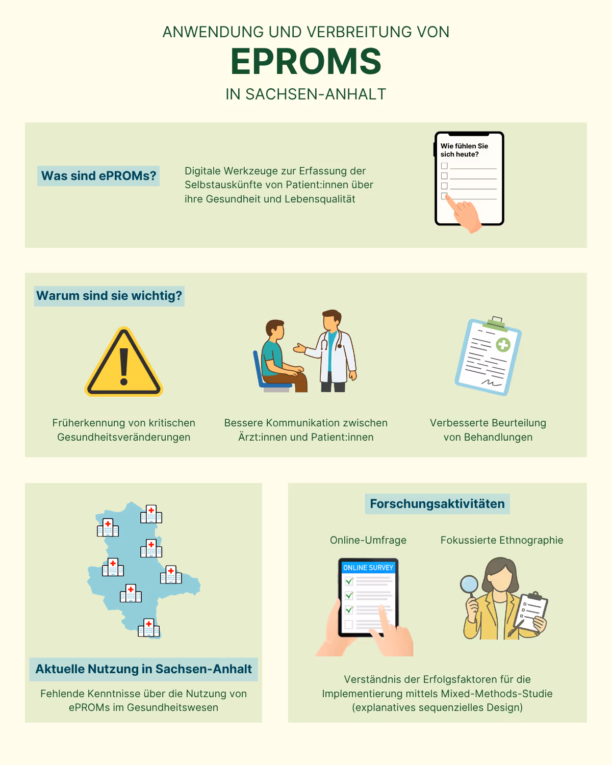 Bislang werden Patient:innenberichte in Kliniken jedoch nur unregelmäßig – in schriftlicher, mündlicher oder elektronischer Form – erhoben. Um die Voraussetzungen für eine systematische und breit angelegte Anwendung von ePROMs zu schaffen, ist zunächst eine Bestandsaufnahme erforderlich, die den aktuellen Stand der Nutzung ermittelt. Eine anschließende Beobachtungsstudie (fokussierte Ethnografie) soll vertiefende Einblicke in erfolgreiche und weniger erfolgreiche Umsetzungen von PROMs/ePROMs liefern.